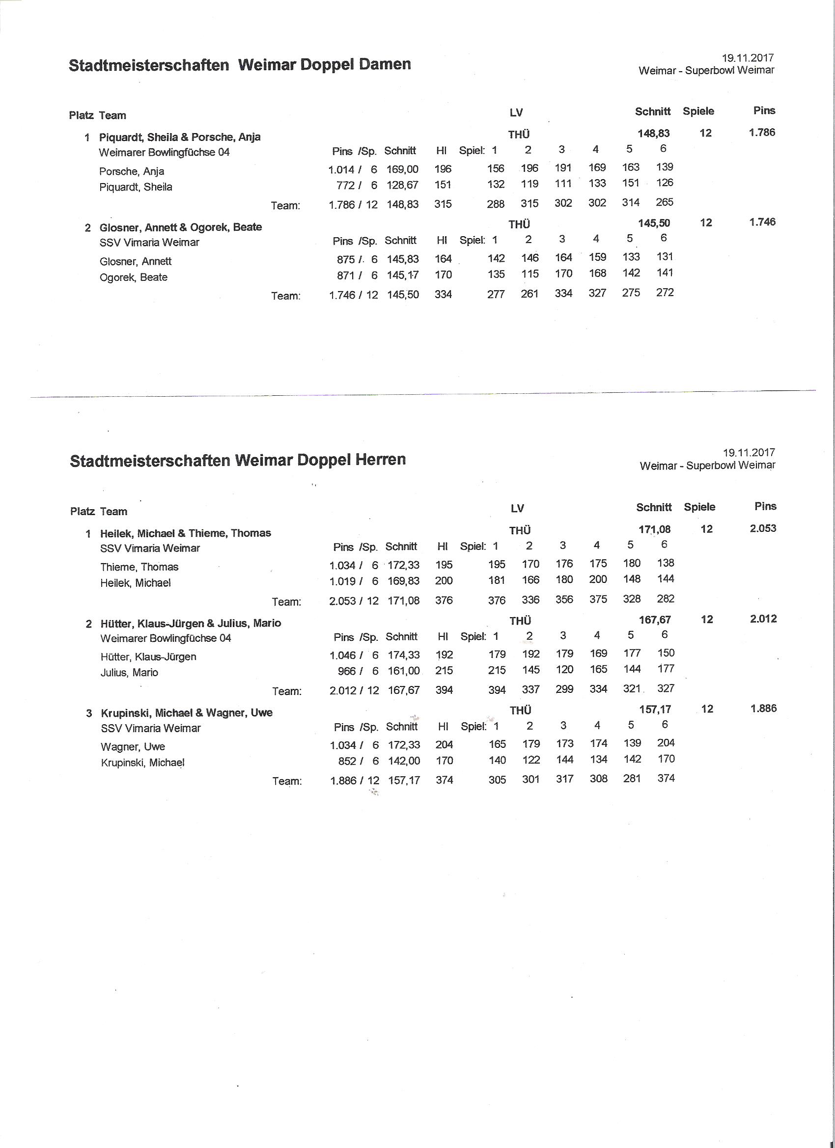 Bowling Ergebnisse Stadtmeisterschaften 2017 im Doppel Foto