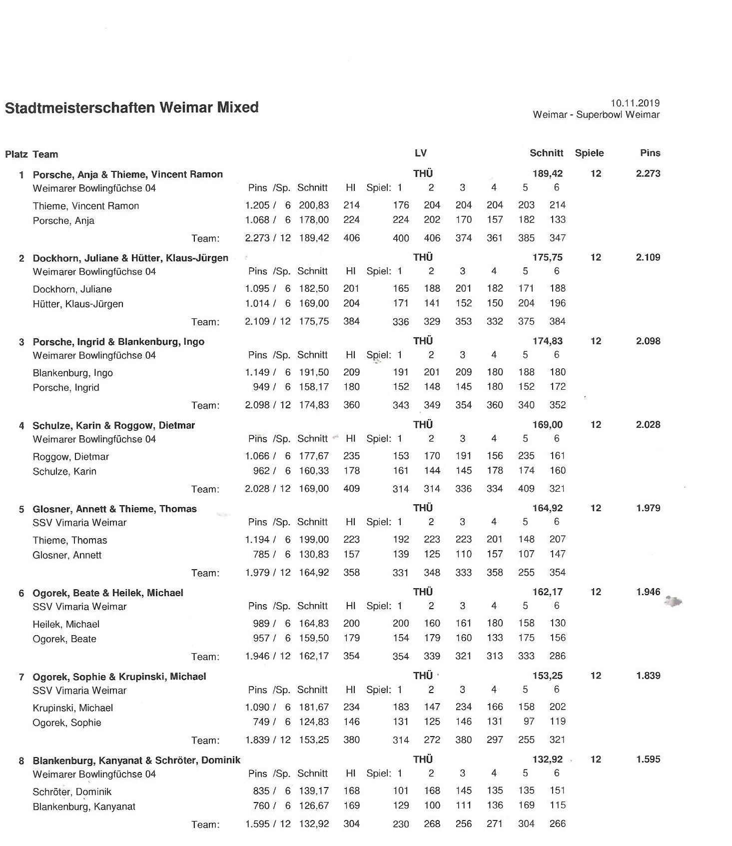 Ergebnisse Stadtmeisterschaft Bowling 2019 Mixed