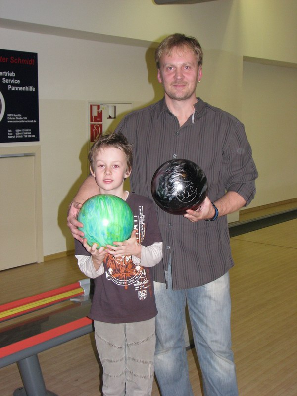 Damen und Herren: Stadtmeisterin: Antje Geßner SSV Vimaria `91 Weimar 1007 Pins 2. Platz: Jutta Matthäs SSV Vimaria `91 Weimar 888 Pins 3. Platz: Maria Schulze Weimarer Bowlingfüchse 04 e.V. 876 Pins Stadtmeister: Klaus-Jürgen Hütter Weimarer Bowlingfüchse 04 e.V. 1132 Pins 2. Platz: Benjamin Busch SSV Vimaria `91 Weimar 1101 Pins 3. Platz: Dirk Stefan Weimarer Bowlingfüchse 04 e.V. 1049 Pins am Rande gesehen: Lukas Kern mit seinem Vater beim Training |