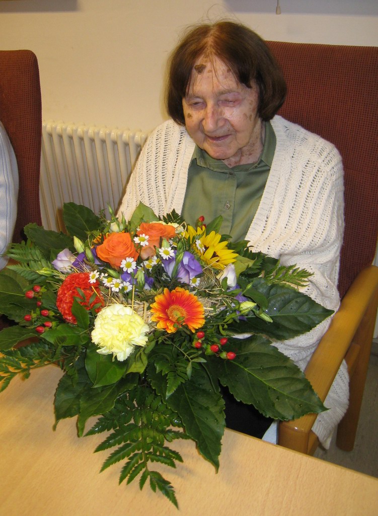 Frau SiegfriedeWeber-Dempe (96 Jahre alt) bekam im "Seebach-Stift" vom Vorsitzenden des KC Kegeln Weimar einen Blumentrauß überreicht