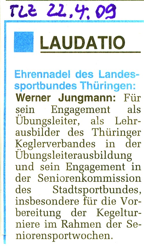 Ehrennadel des LSB Thüringen für Werner Jungmann