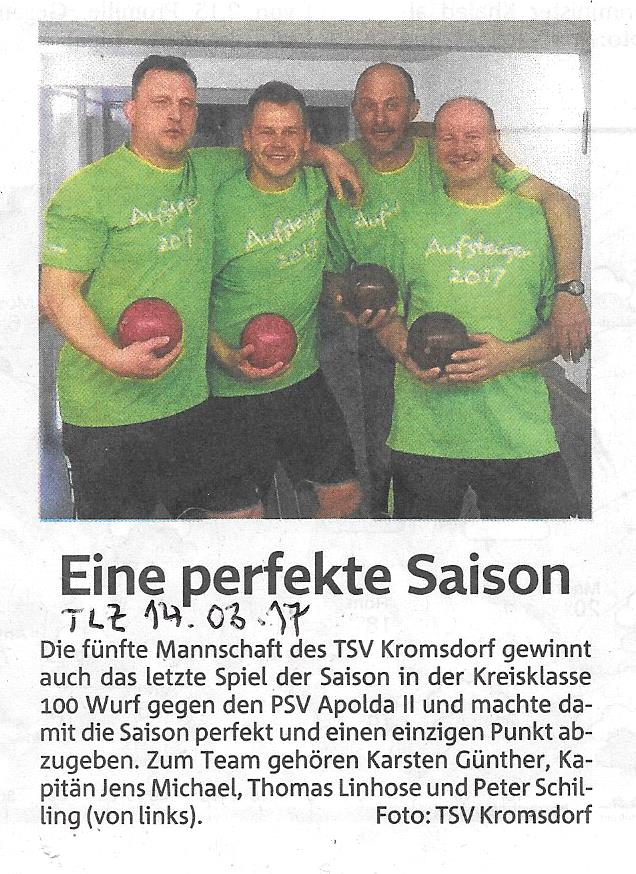 "Eine perfekte Saison" - TSV Kromsdorf 5 Staffelsieger mit 32:0 Punkten