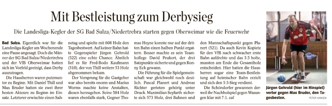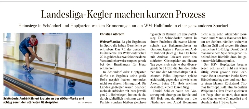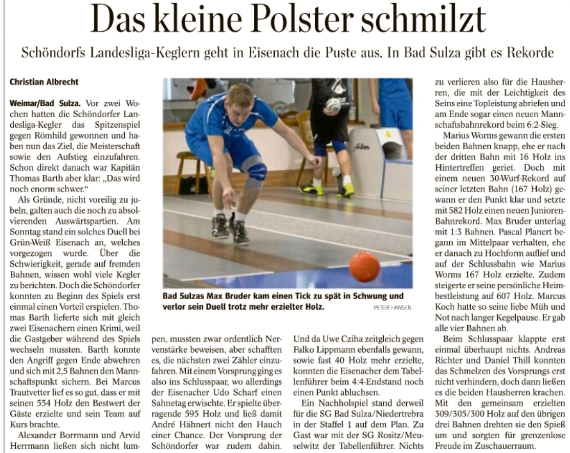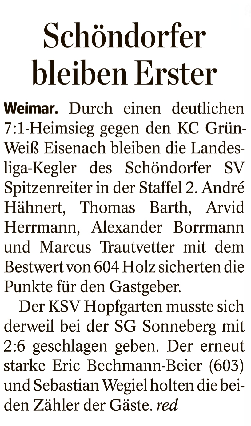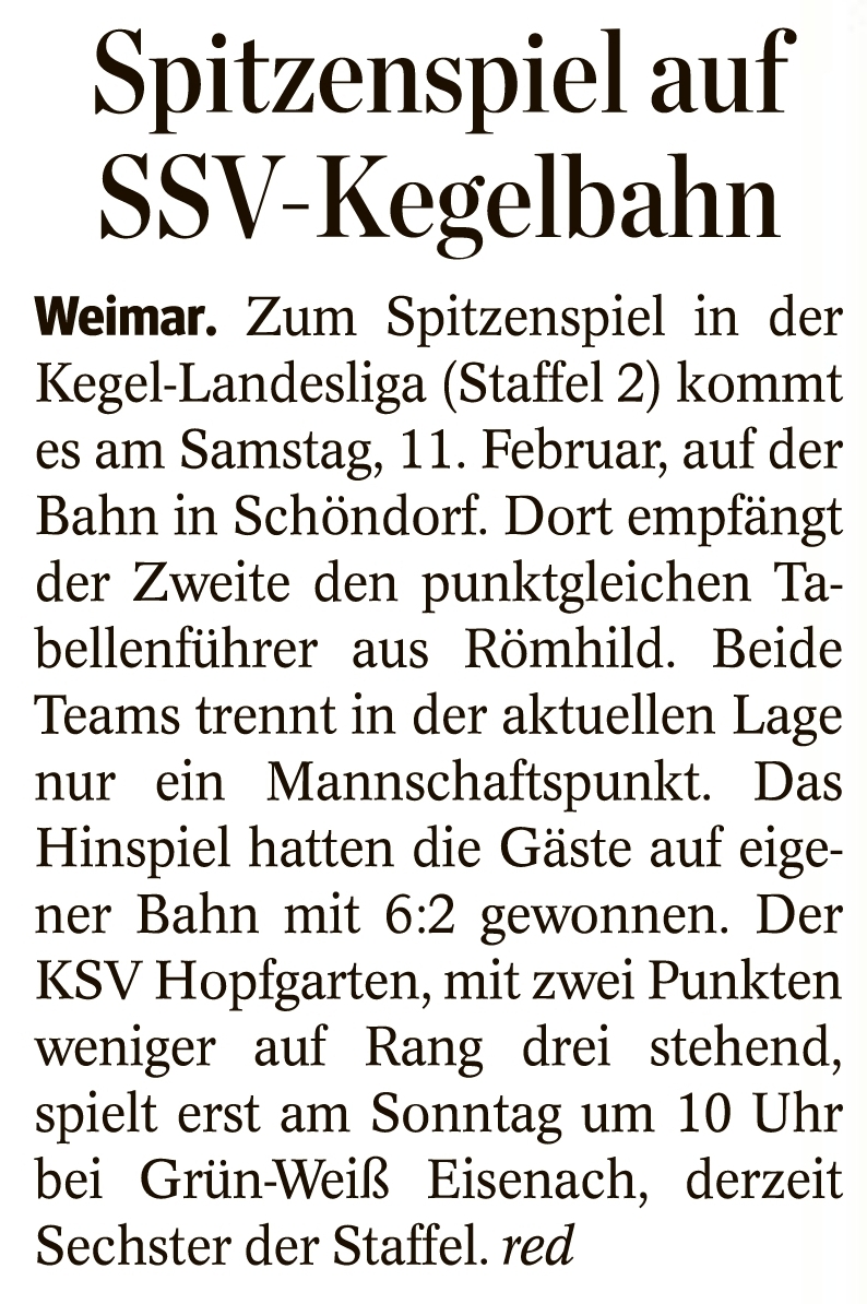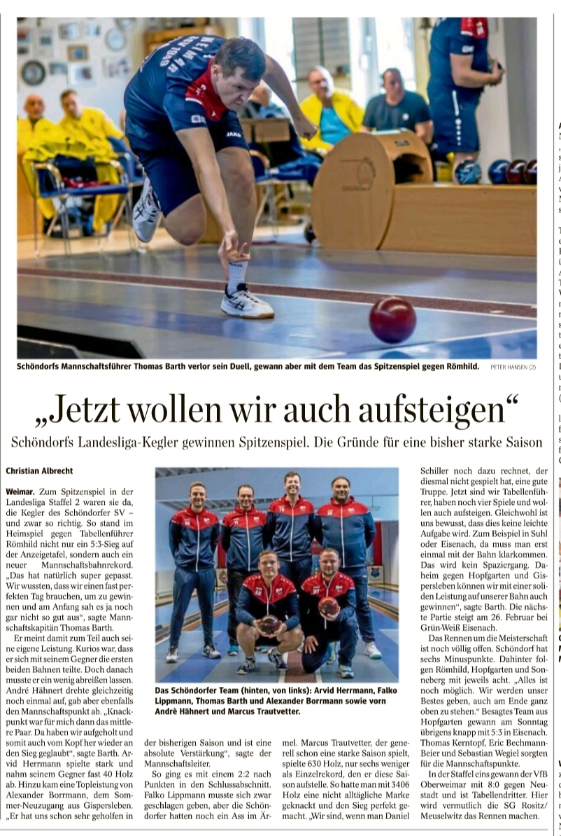 Schöndorfer LL-Kegler gewinnen Spitzenspiel | vom 14.02.2023 | Quelle: TLZ vom 14.02.23 |