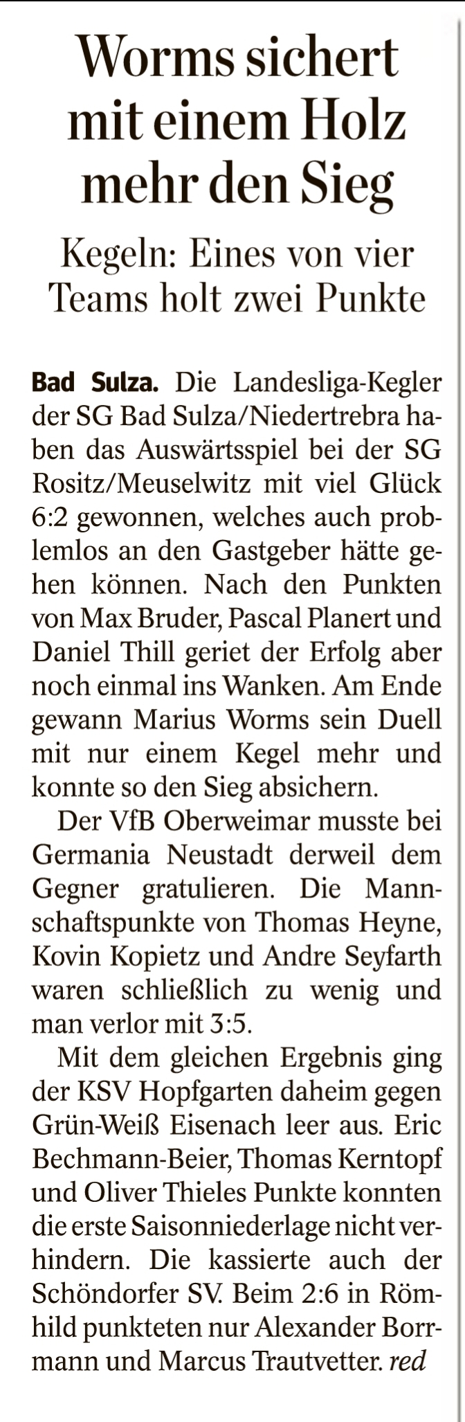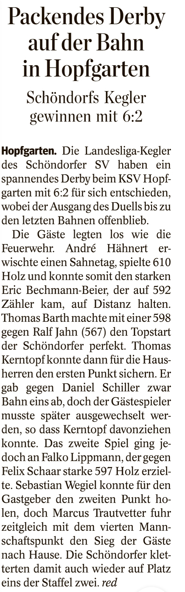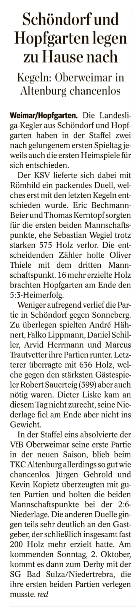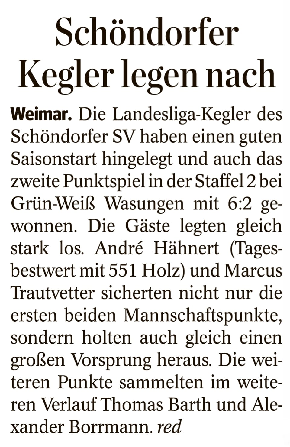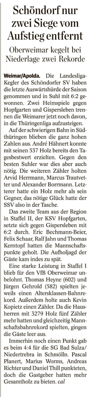 Schöndorfer LL-Kegler gewinnen Spitzenspiel | vom 14.02.2023 | Quelle: TLZ vom 14.02.23 |